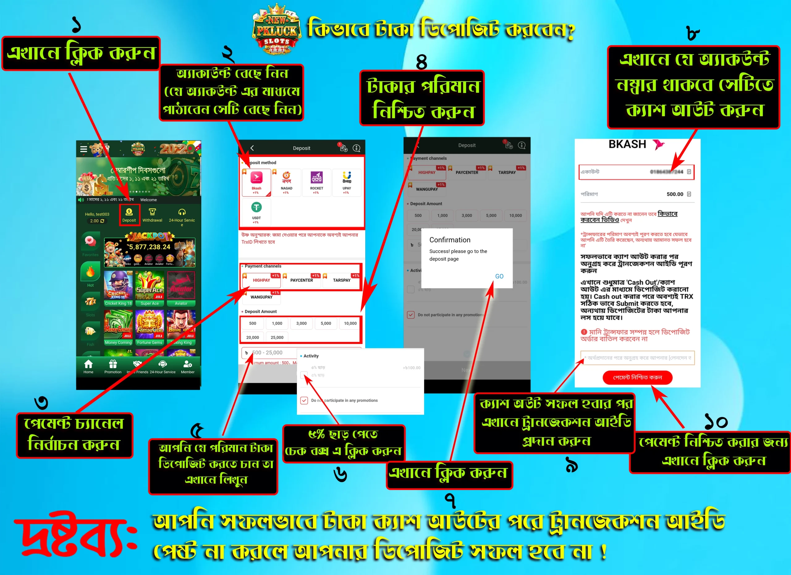 - পেমেন্ট সফল হওয়ার পর আপনাকে শেষ বক্সে “ট্রানজেকশন আইডি” লিখতে হবে। যদি আপনি প্রবেশ না করেন তাহলে আপনি সফলভাবে জমা করতে পারবেন না। জমার বিষয়বস্তু সম্পর্কে কোনও সমস্যা হলে আমাদের গ্রাহক সহায়তা